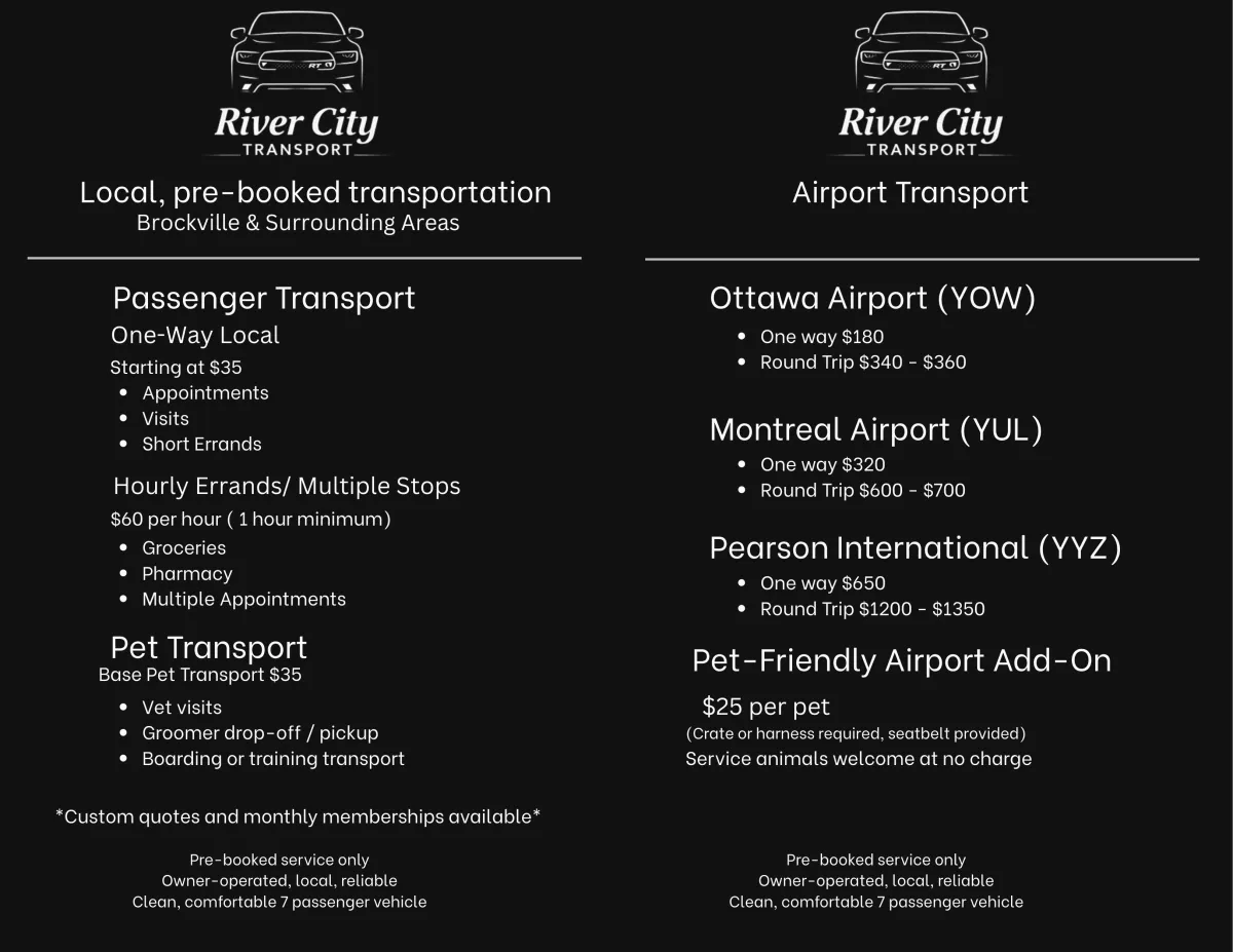 Providing reliable transportation for personal appointments, pet care, and airport travel across Brockville and the 1000 Islands.